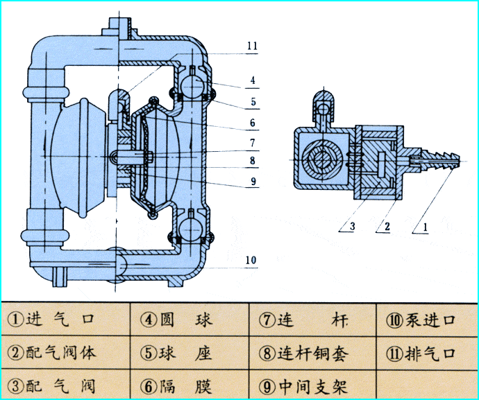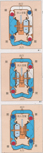 在泵的兩個(gè)對(duì)稱(chēng)工作腔中,各裝有一塊有彈性的隔膜,聯(lián)桿將兩塊隔膜結(jié)成一體,壓縮空氣從泵的進(jìn)氣頭進(jìn)入配氣閥后,推動(dòng)兩個(gè)工作腔內(nèi)的隔膜,驅(qū)使聯(lián)桿聯(lián)接的兩塊隔膜同步運(yùn)動(dòng)。與此同時(shí),另一工作腔中的氣體則從隔膜的背后排出泵外。一旦到達(dá)行程終點(diǎn)。配氣機(jī)構(gòu)則自動(dòng)地將壓縮空氣引入另一個(gè)工作腔,推動(dòng)隔膜朝相反方向運(yùn)動(dòng),這樣就形成了兩個(gè)隔膜的同步往復(fù)運(yùn)動(dòng)。每個(gè)工作腔中設(shè)置有兩個(gè)單向球閥,隔膜的往復(fù)運(yùn)動(dòng),造成工作腔內(nèi)容積的改變,迫使兩個(gè)單向球閥交替地開(kāi)啟和關(guān)閉,從而將液體連續(xù)地吸入和排出。