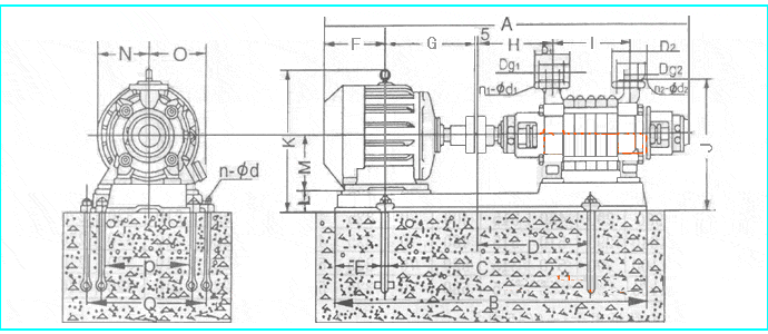 臥式多級(jí)離心泵外形安裝尺寸圖: