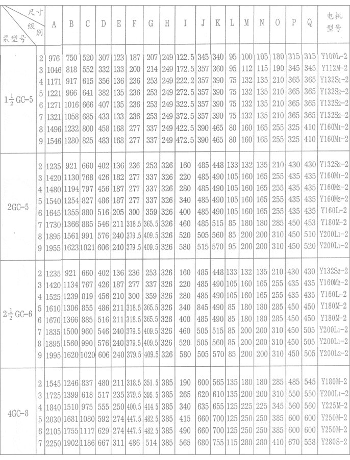 GC型臥式多級(jí)離心泵外形安裝尺寸表: