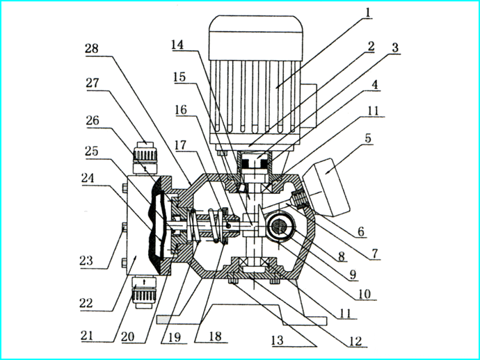 | 1 | 電機(jī) | 8 | 偏心輪軸承 | 15 | 頂桿 | 22 | 泵頭 |