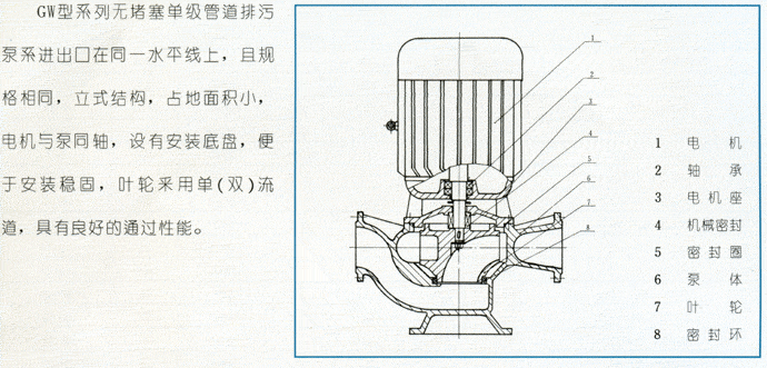 GW型無堵塞管道排污泵是在引進國外先進技術(shù)的基礎(chǔ)上,結(jié)合國內(nèi)水泵的使用特點而研制成功的新一代泵類產(chǎn)品,具有節(jié)能效果顯著、防纏繞、無堵塞、自動安裝和自動控制等特點。在排送固體顆粒和長纖維垃圾方面,具有獨特效果。 該系列泵采用獨特葉輪結(jié)構(gòu)和新型機械密封,能有效地輸送含有固體物和長纖維。葉輪與傳統(tǒng)葉輪相比,該泵葉輪采用單流道或雙流道形式,它類似于一截面大小相同的彎管,具有非常好的過流性,配以合理的蝸室,使得該泵具有效率高、葉輪經(jīng)動靜平衡試驗,使泵在運行中無振動。